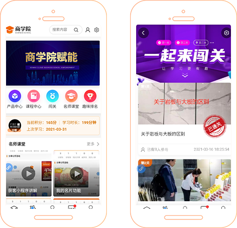 本系統可以將品牌下相關產品知識、最新產品介紹,以及營銷干貨、名師視頻分享課程等,都通過培訓內容的形式輸出給全線經銷商、門店。通過營銷干貨、名師直播課等的輸出,可對標渠道招商政策中關于營銷培訓的一部分扶持。而商學院所有的學習項目,都可以通過趣味闖關,激勵參與者不斷突破升級,讓經銷商與品牌方形成一定黏度。